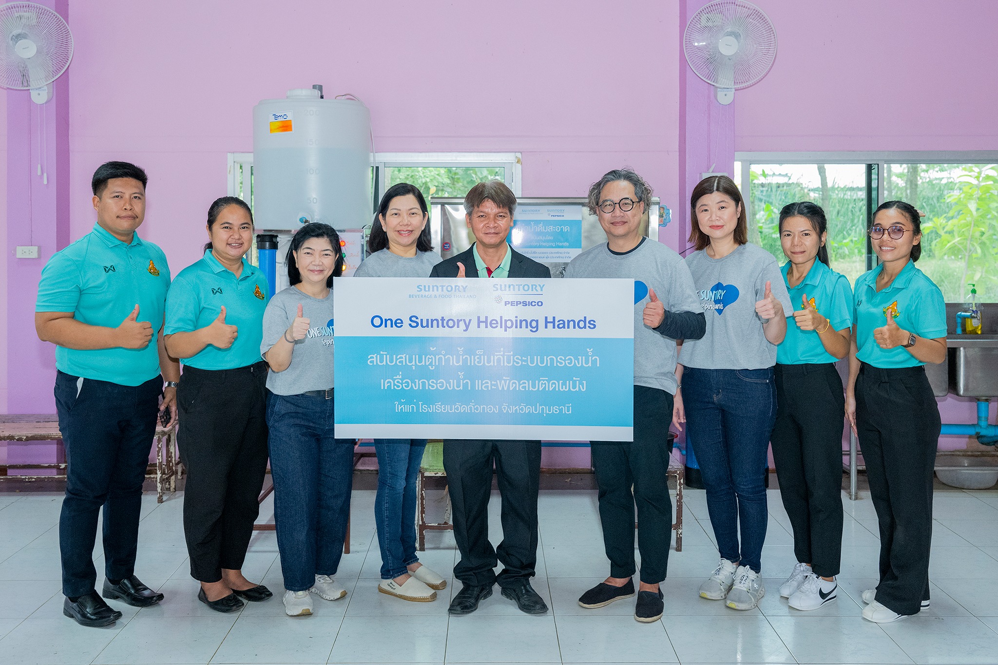 เบเวอเรจ (ประเทศไทย) จำกัด กล่าวว่า “กิจกรรม ‘One Suntory Helping Hands 2025’ สะท้อนให้เห็นถึงการนำ ค่านิยมองค์กร ‘การตอบแทนกลับคืนสู่สังคม” (Giving Back to Society) ของกลุ่มบริษัทซันโทรี่ มาปฏิบัติให้เกิดขึ้นอย่างเป็นรูปธรรม โดยเปิดโอกาสให้เพื่อนพนักงานได้ร่วมระดมทุนผ่านกิจกรรม ‘One Suntory Bring & Buy’ ซึ่งเราสามารถระดมทุนได้มากถึง 1.2 ล้านบาท เพิ่มขึ้นกว่าปีแรกที่เริ่มต้นโครงการกว่าเท่าตัว สะท้อนให้เห็นถึง ‘พลังแห่งการให้’ ของพนักงาน ‘วัน ซันโทรี่’ ที่มีความตั้งใจจริงเพื่อร่วมกันสร้างประโยชน์ให้กับสังคม สำหรับปีนี้ เราได้นำเงินส่วนหนึ่งจากการระดมทุนไปจัดซื้อตู้ทำน้ำเย็นที่มีระบบกรองน้ำ เครื่องกรองน้ำดื่มสะอาด และถังเก็บน้ำ ให้แก่โรงเรียนวัดถั่วทอง จังหวัดปทุมธานี ซึ่งได้รับการพิจารณาให้ความช่วยเหลือเป็นแห่งแรกภายใต้โครงการนี้ พร้อมทั้งนำพนักจิตอาสาลงพื้นที่เพื่อปรับปรุงอาคารโรงเรียน สร้างสภาพแวดล้อมในการเรียนที่เหมาะสมและปลอดภัย ตลอดจนยกระดับคุณภาพชีวิตของเยาวชนผู้ด้อยโอกาส โดยบริษัทจะพิจารณาให้ความช่วยเหลือแก่โรงเรียนและมูลนิธิในจังหวัดระยอง สระบุรี ชลบุรี นครปฐม และกรุงเทพฯ”