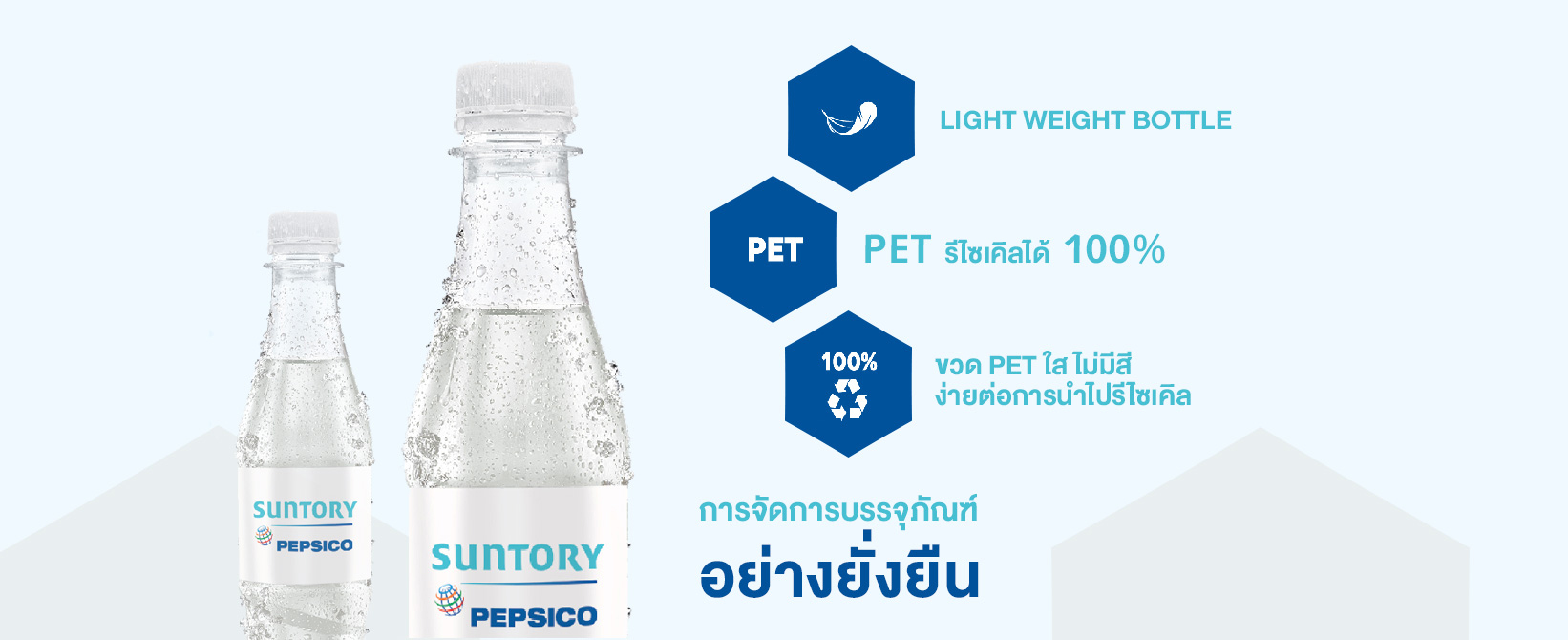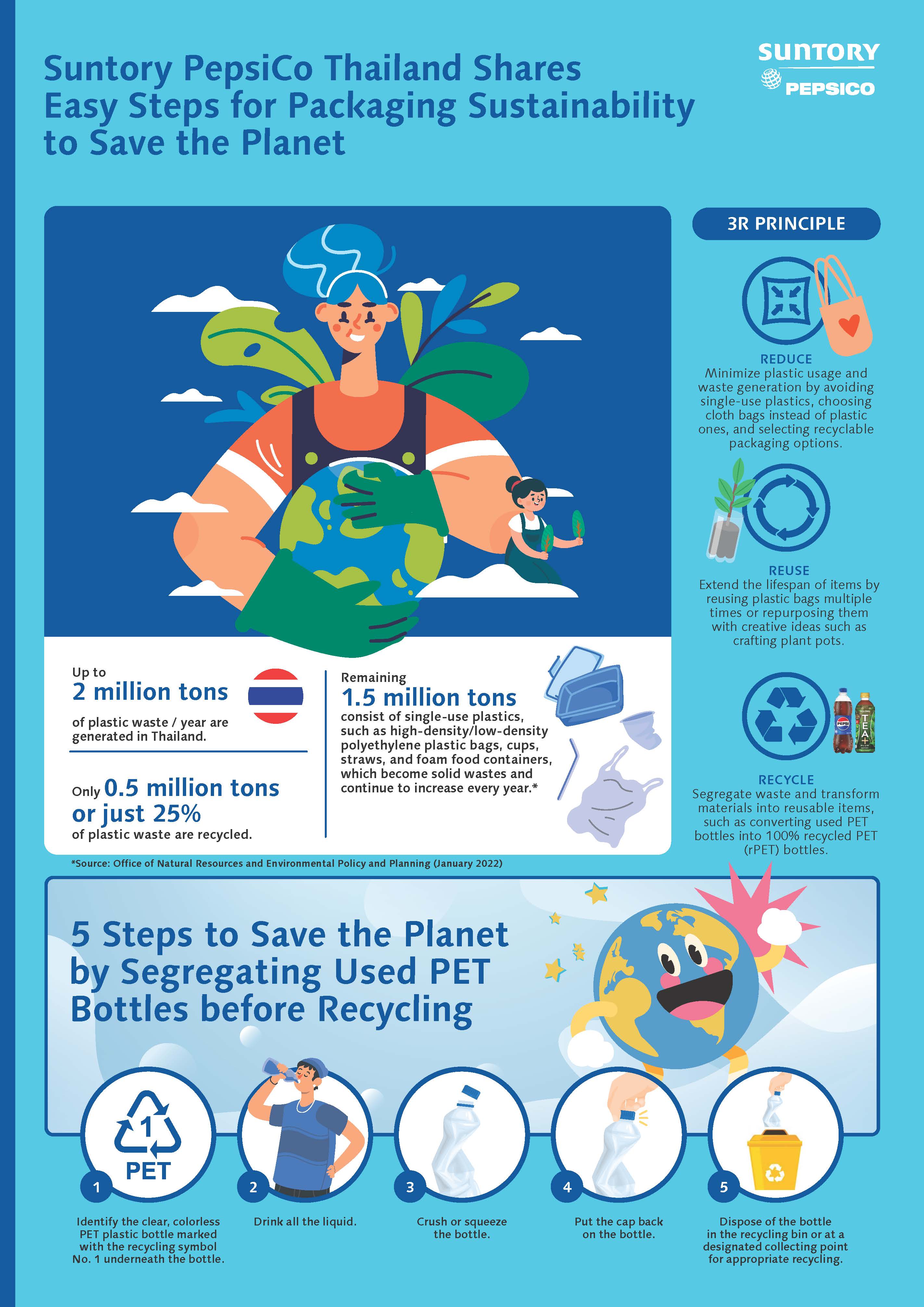 ซันโทรี่ เป๊ปซี่โค ประเทศไทย ในฐานะผู้ผลิตและจัดจำหน่ายผลิตภัณฑ์เครื่องดื่ม เราตระหนักถึงความสำคัญของบรรจุภัณฑ์พลาสติกในการปกป้องคุณภาพและความปลอดภัยของผลิตภัณฑ์ก่อนส่งถึงมือผู้บริโภค ในขณะเดียวกันก็ร่วมมือกับภาครัฐและเอกชนในการแก้ปัญหาขยะพลาสติกที่เกิดจากการจัดการบรรจุภัณฑ์หลังการบริโภคอย่างไม่เหมาะสมมาโดยตลอด เรามุ่งมั่นลดการใช้พลาสติกใหม่ และส่งเสริมการจัดการบรรจุภัณฑ์อย่างยั่งยืน (Sustainable Packaging Management) ตั้งแต่การเลือกใช้วัสดุและการออกแบบบรรจุภัณฑ์ที่เป็นมิตรต่อสิ่งแวดล้อม เพื่อให้ง่ายต่อการจัดการและสามารถนำกลับมารีไซเคิลได้ การให้ความรู้เกี่ยวกับการคัดแยกขยะและบรรจุภัณฑ์ใช้แล้วอย่างเหมาะสม ตลอดจนการเก็บกลับขวด PET ใช้แล้วเพื่อนำไปรีไซเคิลกลับมาผลิตเป็นขวดอีกครั้ง หรือที่เรียกกันว่า “ขวด rPET” (Recycled PET bottles) หมุนเวียนใช้ใหม่ได้ไม่รู้จบ ซึ่งจะช่วยลดปัญหาขยะพลาสติกอย่างเป็นรูปธรรมภายใต้แนวคิดเศรษฐกิจหมุนเวียน (Circular Economy) เราจึงขอแนะนำหลักการ 3R (Reduce-Reuse-Recycle) และ 5 ขั้นตอน “รักษ์โลก” เพื่อแยกขวด PET ที่ใช้แล้ว ก่อนส่งเข้าสู่กระบวนการรีไซเคิล โดยทุกคนสามารถทำตามได้ง่าย ๆ